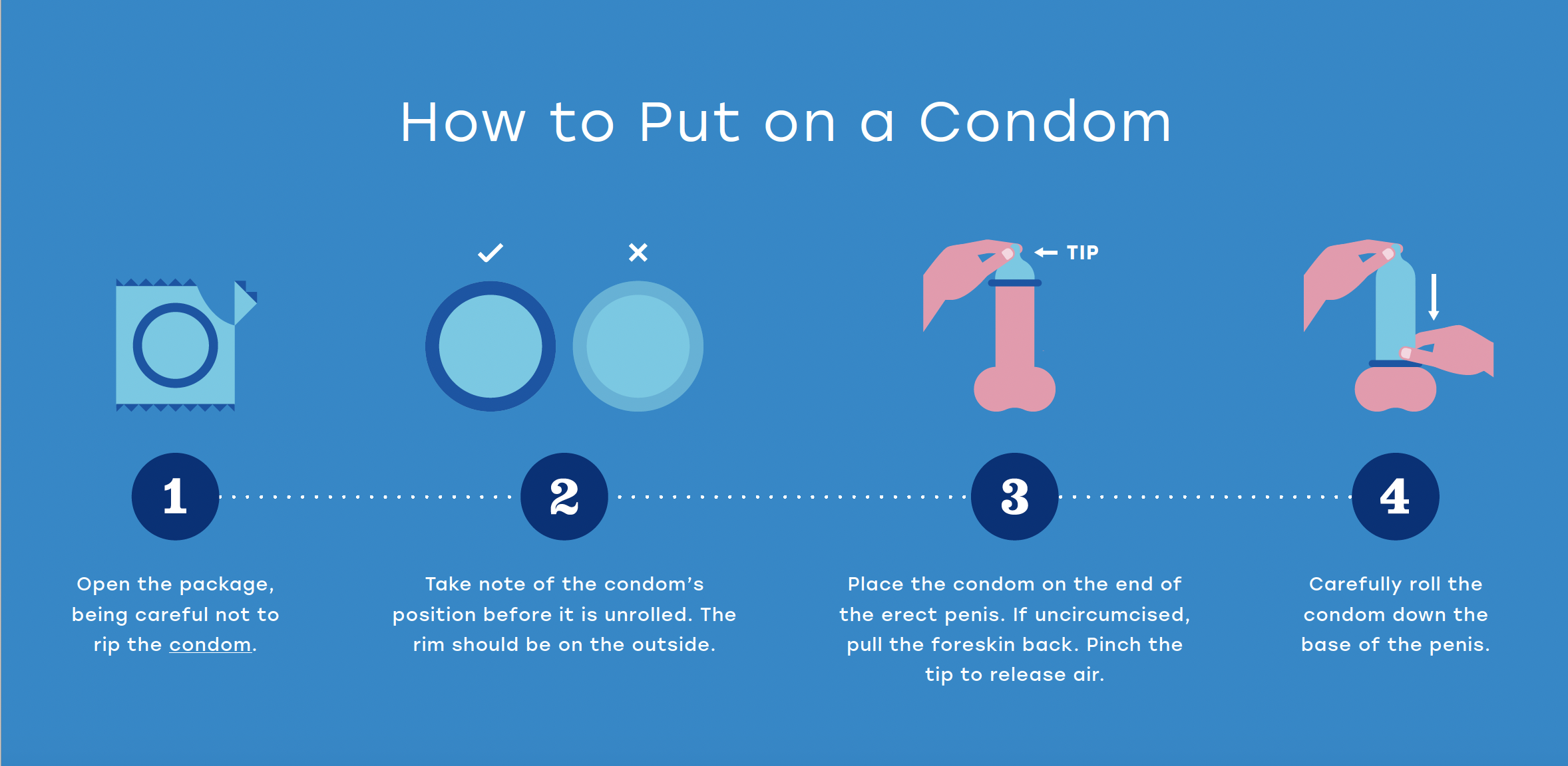 Bước 2: Kiểm tra kỹ và đặt mặt ngoài của bao cao su lên đầu dương vật đã cương cứng. Nếu bạn chưa cắt bao quy đầu, hãy dùng tay vuốt bao quy đầu lên trước khi đeo bao.