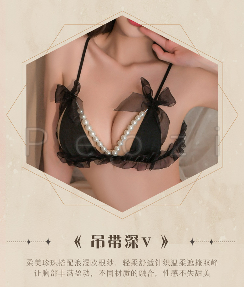 Thiết kế cực kỳ nữ tính và gợi cảm với voan nhún, voan nơ và các chuỗi ngọc trai phối hợp. Nhưng yên tâm là không hề sến súa và bánh bèo nha. Sự nữ tính ngọt ngào nhưng pha chút bí ẩn của set đồ lót này chắc chắn làm đối tác của bạn "chào cờ" ngay khi nhìn thấy.