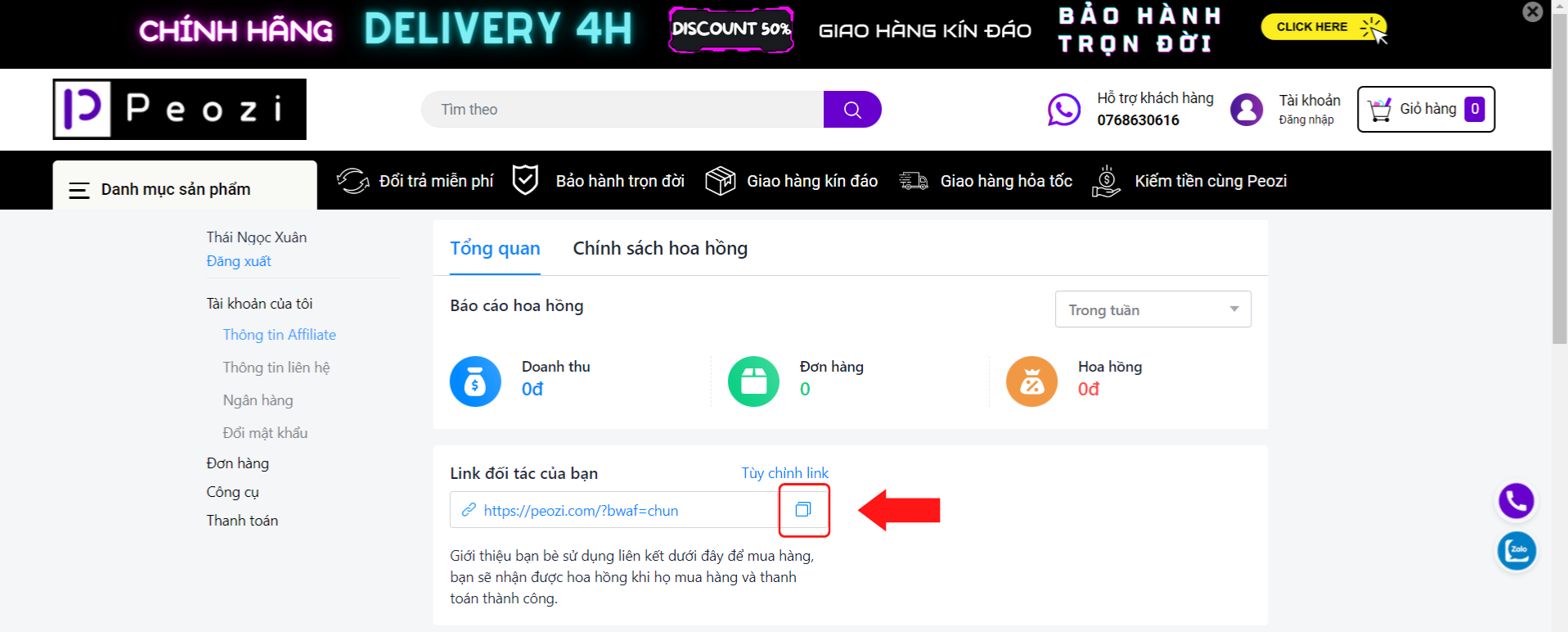 Sau khi đăng ký tham gia thành công, tài khoản đối tác sẽ chuyển về giao diện Thông tin Affiliate trên website. Lúc này, đối tác có thể copy link Affiliate để gửi tới các khách mua hàng tiềm năng, để mang về nhiều đơn hàng để nhận hoa hồng Affiliate