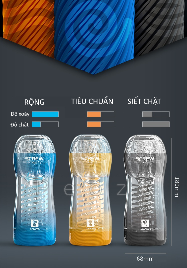 Cốc nam giới Galaku Screw có phần dọc thân nhỏ, ôm sát, không có cấu trúc quá phức tạp. Tất cả đều là dạng xoắn với những khác biệt nhỏ về bố trí bi hay vân nổi. Nhưng riêng phần đầu silicone, cốc cho thấy sự phức tạp rõ rệt trong thiết kế với 2 vòng ôm cùng các điểm lồi, lõm nhằm tạo cảm giác mạnh cho phần đầu dương vật.